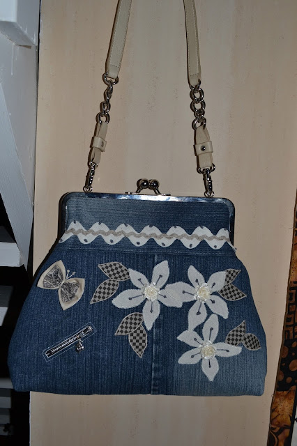 Ompelin miniäni vanhoista farkuista tämän ison laukun. Ostin eräästä laukkuja tekevästä liikkeestä muovikassillisen laukkujen kantohihnoja ja sieltä löytyi sopiva tähän laukkuun. Tähän laukkuun mahtuu tavaraa. Cutterhman - liimalla kiinnitin metallisen sulkijan.